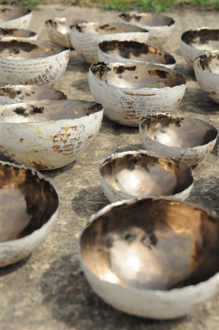 In the early 90’s I started experimenting with organic bowl forms using slip and combustible materials such as straw and paper. I then discovered a way of transferring script and drawings onto ceramic by using photocopies and slip. I loved the effects this achieved – a sense of aging and decay like fragments of old frescos  on the walls of an ancient building. I had an idea of one day combining these techniques to create an installation made up of many bowls, but although the thoughts were recorded in my sketchbook they were not, at the time, realized.